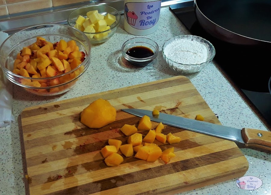 - Pelamos los melocotones y los troceamos en dados pequeños.