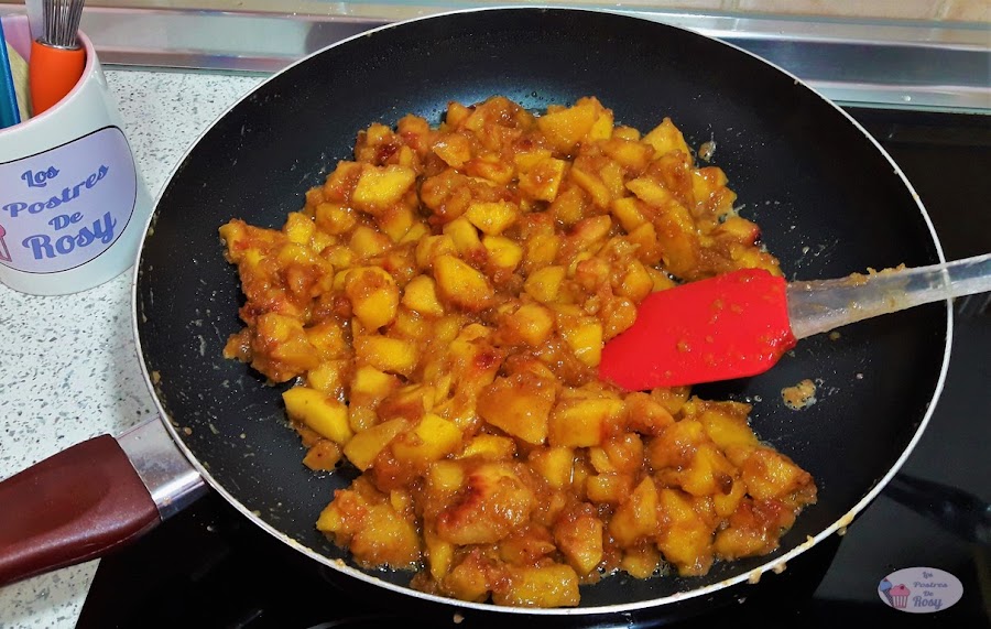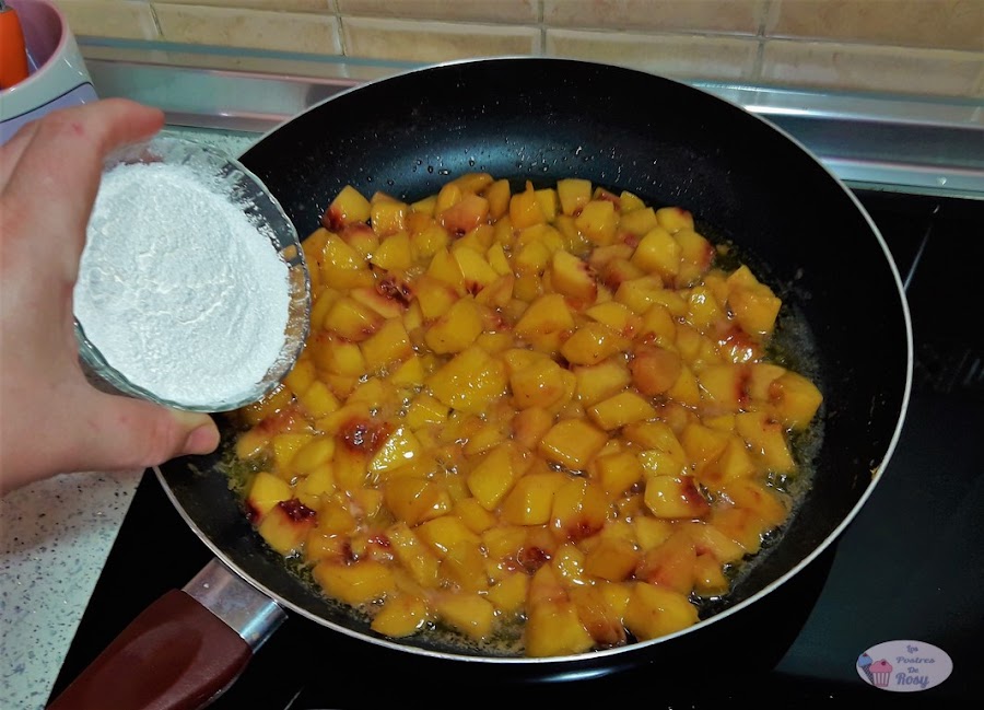 Rellenamos con el melocotón cocinado y extendemos bien hasta rellenar todo el molde sin dejar huecos.