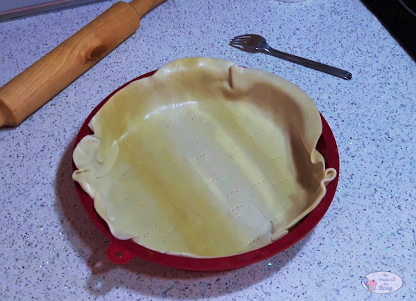 Forramos el molde con una lámina de masa y pinchamos con un tenedor.