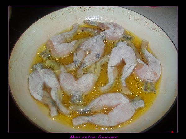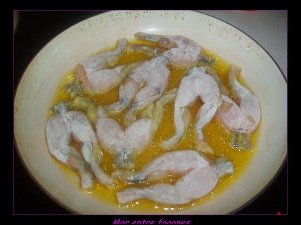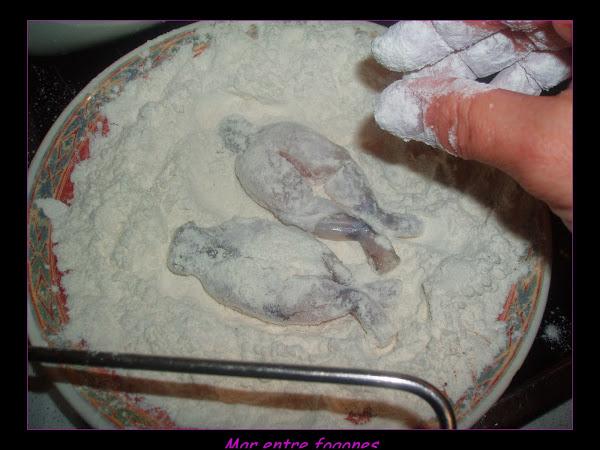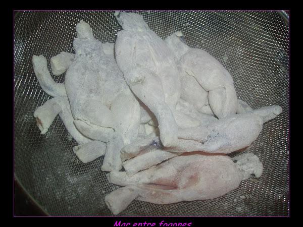 Mientras calienta el aceite, enharinamos la primera tanda de ancas que vamos a freír.