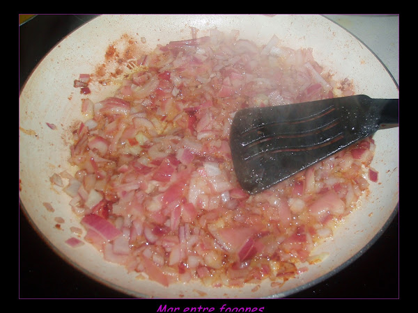 Cuando las tenemos todas fritas, añadimos en ese aceite la cebolla sal y un pellizco de azúcar.