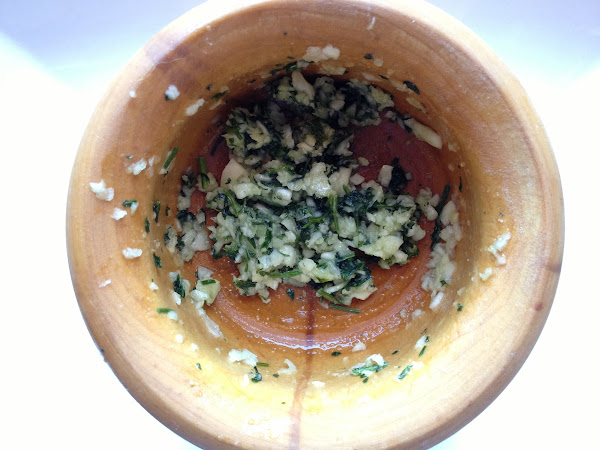 1 Comenzamos pelando los 5 dientes de ajo y cortándolos en cachitos, los vamos a machacar en el mortero junto a una buena cantidad de perejil y sal . La sal lo que nos ayuda es a romper mejor el ajo y el perejil. Una vez machacado, reservamos y preparamos las anchoas .
