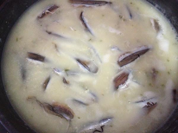 5 Ahora que tenemos la textura que deseamos de la salsa, añadiremos las anchoas enteras a la cazuela, poco a poco ehh, para que no se rompan.