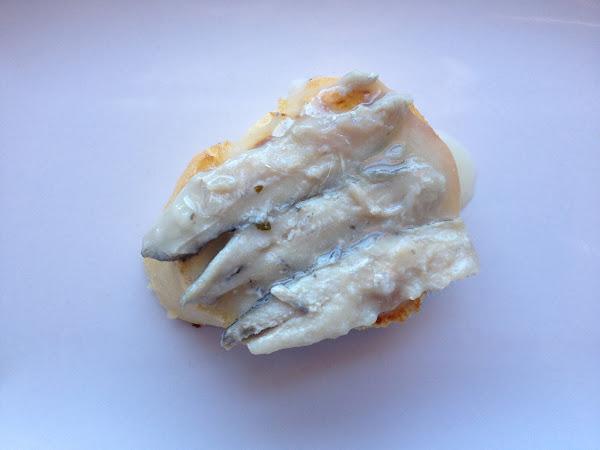 9 Ummmm ¡¡¡ Esto ya huele de maravilla, comenzamos a emplatar. Con la ayuda de una cuchara, colocamos sobre el primer pan unas 2 o 3 anchoas, solo los lomos y un poco de salsa .