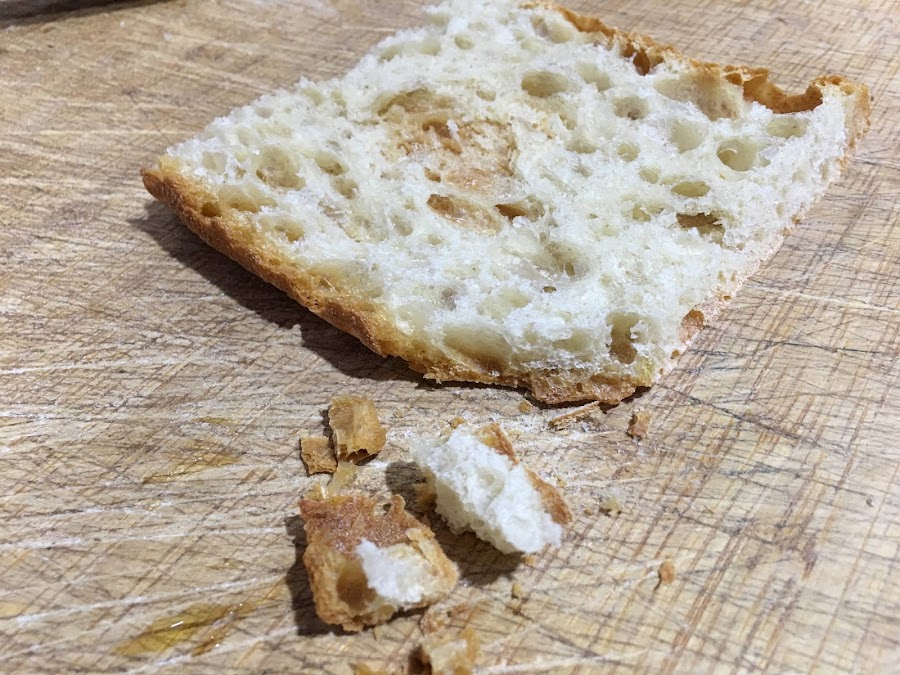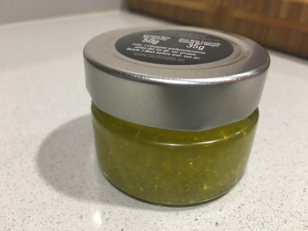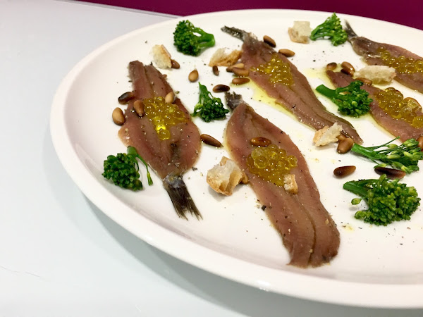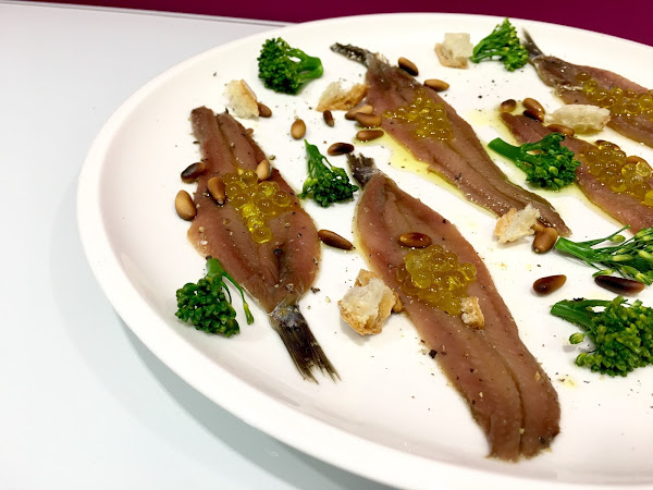 4. Repartimos los tallos de Bimi entre las anchoas, os aseguro que la mezcla es deliciosa. Rompemos la tostada de pan de coca a pedazos y la disponemos en el plato. Ponemos los piñones tostados alrededor y colocamos el caviar de AOVE encima de las anchoas, el toque del caviar de la Chinata es el súmmum en este plato. Espectacular.