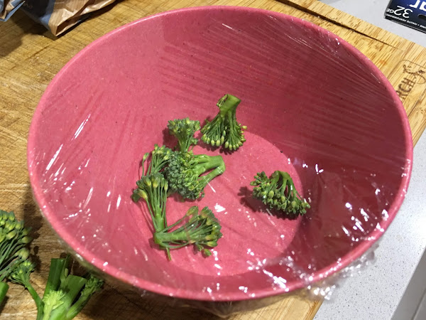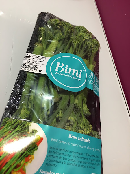 2. Preparamos el Bimi al vapor. Para esta receta nos quedaremos sólo con tallos de la flor, la parte superior del Bimi. Los cortamos y lavamos. Colocamos los tallos en un bol, lo cubrimos de film y los llevamos al microndas 1 minuto. El Bimi tiene un sabor muy suave, dulce y delicado que consigue darle a este plato un buen contraste. El Bimi es una hortaliza fruto de la unión natural entre el brócoli y una col oriental llamada Kai-lan.