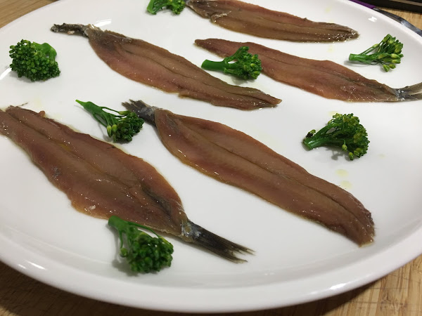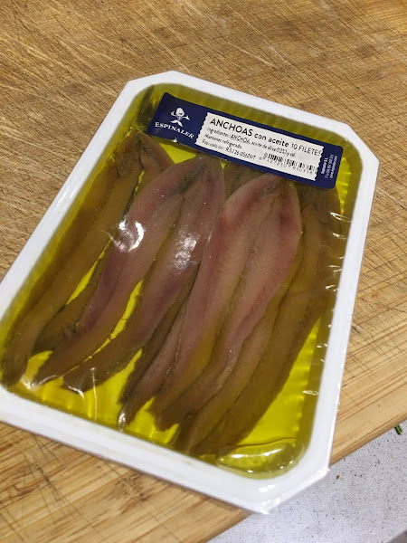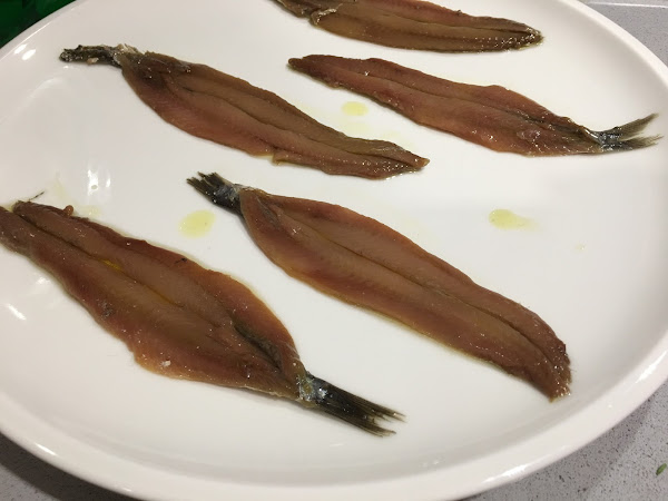 3. Finalmente disponemos los filetes de anchoas al natural en el plato. Las de Espinaler, son mis preferidas, para mi las mejores con diferencia, si os fijáis aún están unidas por su cola, con una presentación muy cuidada. Tienen un proceso de maduración de 8 a 12 meses, y están limpiadas a mano. Su sabor intenso, con el punto de sal perfecto.