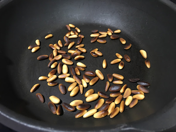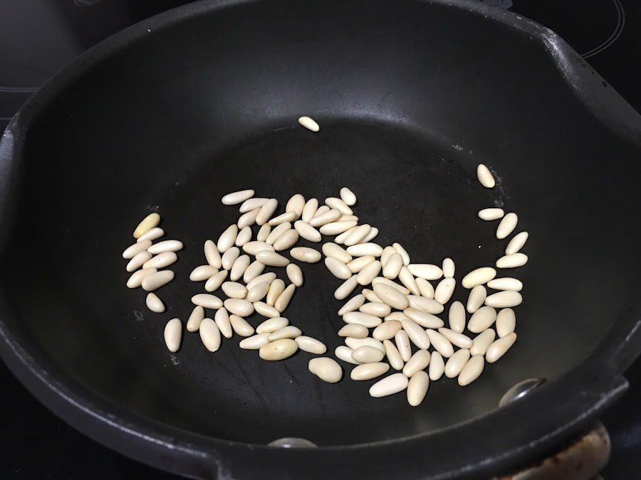 1. Empezamos tostado a fuego medio los piñones en una sartén antiadherente. Debemos conseguir un tono muy tostado para asegurar que queden bien crujientes.