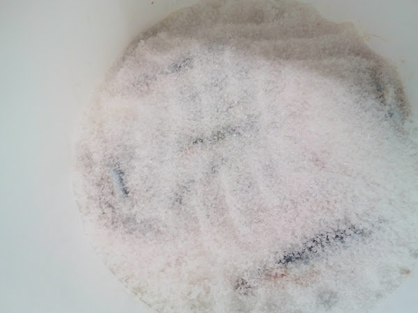 4.- Volvemos a poner capa de sal y así sucesivamente tantas capas de sal y boqueron hasta finalizar con la última de sal.