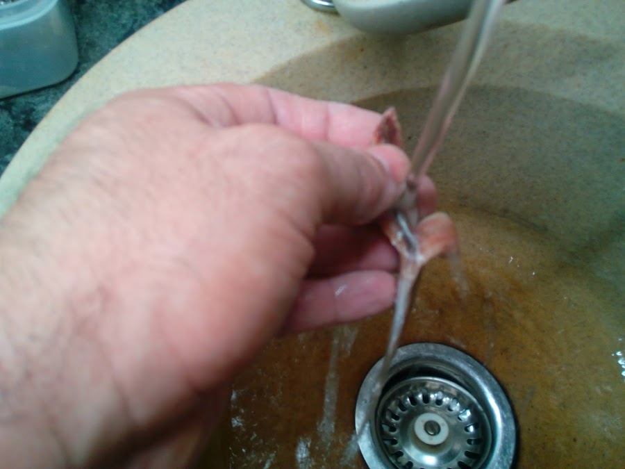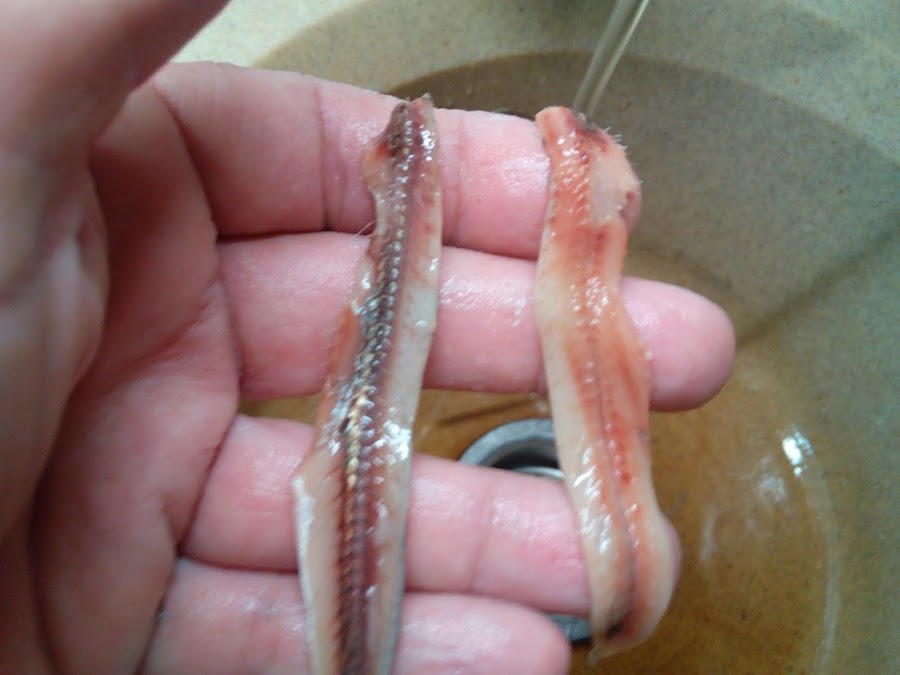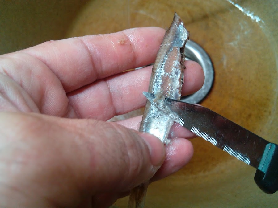 7.- Para limpiarlas, primero las escurrimos, luego cortamos cabeza, cola y espinas de las tripas. Pasamos el borde del cuchillo por los lomos para retirar escamas y piel. Ahora bajo un pequeño caño de agua vamos separando con las manos desde arriba hacia abajo los lomos de la espina central, primero un lado y luego el otro. Si lo hacemos bajo el agua resultará mucho más fácil.
