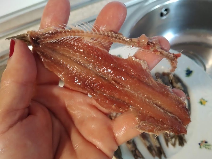 abrir el boquerón presionando con los dedos la espina dorsal desde la cabeza hasta la cola y retirar la espina central. Enjuagar bajo el grifo, quitando con sumo cuidado las espinas que queden adheridas en los lomos (sobre todo en la parte de la barriga del animal.