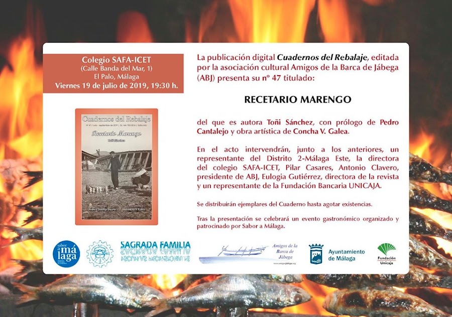Tengo el placer de anunciarles que mañana, día 19, en el Palo, concretamente en el Salón de Actos del Colegio SAFA-Ciet, la Asociación Cultural Amigos de la Barca de Jábega presenta su CUADERNOS DEL REBALAJE, nº 47 titulado “RECETARIO MARENGO”, tengo el honor de ser su autora. 48 páginas con recetas populares marengas.