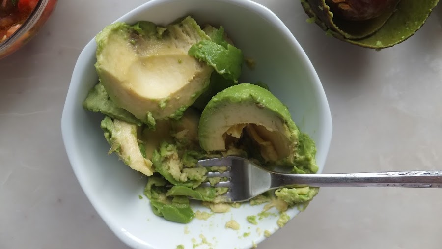 4. Tritura la carne del aguacate con un tenedor y añade la pasta de cebolla, el zumo de lima y la sal. Mezcla bien e incorpora por último la cebolla y los tomates, con cudidado de no aplastarnos demasiado para que pierdan agua. Corona con cilantro.