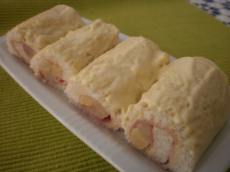 Untar un trozo de pan de molde (sin los bordes) con la mayonesa, colocar encima jamón cocido y en uno de los bordes, espárragos blancos (dependiendo del grosor uno, o varios). Enrollarlos y volver a untar el exterior de mayonesa.