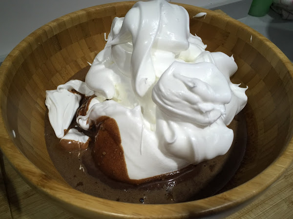 6. Añadimos las claras montadas a la mezcla del chocolate y café. Con ayuda de la espátula y con muchísima delicadeza integramos las dos mezclas entre sí.