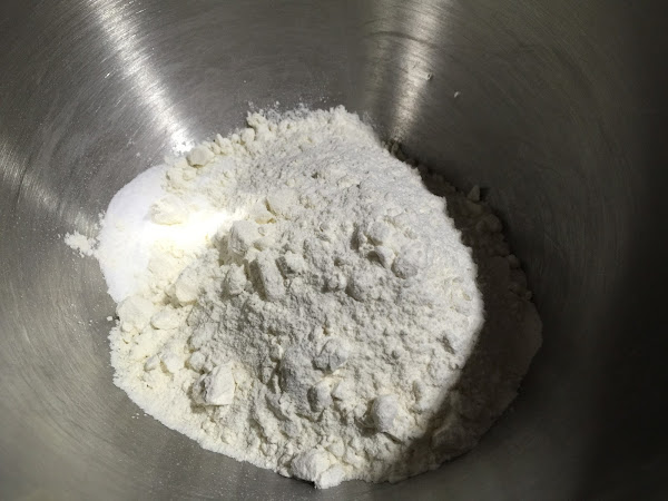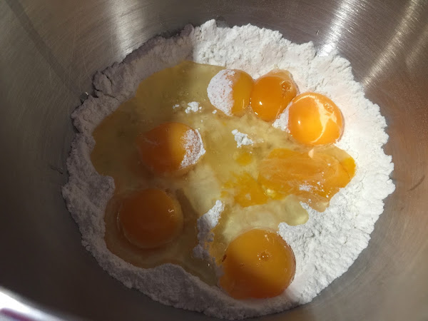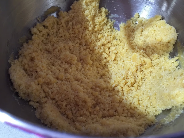 2. Ponemos en el bol de la KA el azúcar, la harina y las 7 yemas de gallinas felices. Removemos hasta que tengan aspecto de migas. Añadimos también la vainilla en pasta.