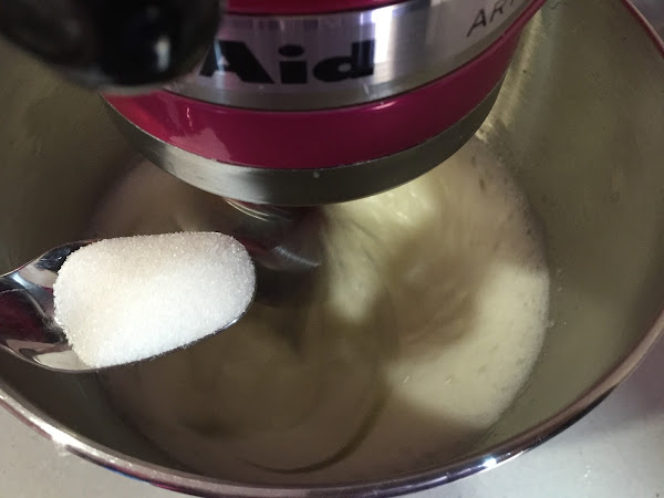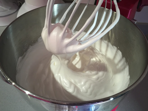 Bajamos a velocidad media-baja, sin dejar de batir ningún momento. Añadimos el azúcar, cada 7 segundos una cucharada. Así progresivamente hasta incorporar todo el azúcar. Cuando hayamos integrado todo el azúcar, las claras estarán brillantes.