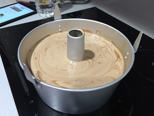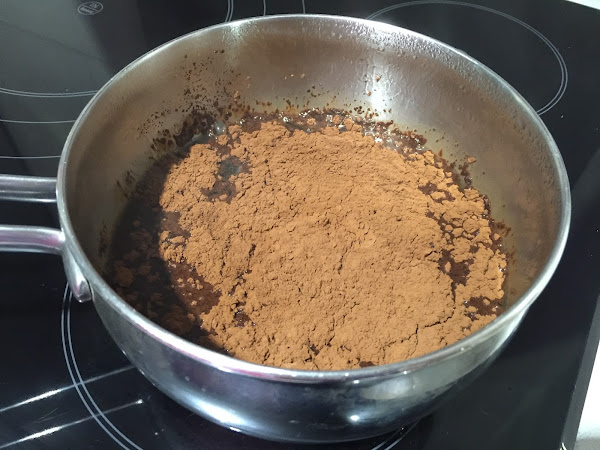 1. Empezamos preparando el toque especial de nuestro angel food cake, el chocolate y el café. Ponemos los 400ml de la agua en una ollita, ponemos el fuego alto y justo cuando empiece a hervir añadimos el cacao y el café, removemos durante 1 minuto y paramos el fuego. Dejamos templar y reservamos para más adelante.