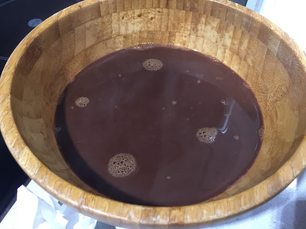 3. Cuando haya enfriado por completo añadimos la mezcla de chocolate, café y agua teníamos reservada poco a poco. Una vez se hayan integrado todos los ingredientes los vertemos todo en un bol y reservamos para más adelante.