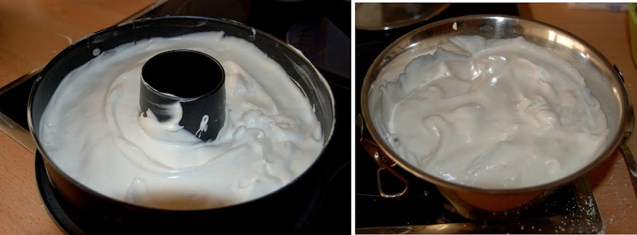 Para conseguir tanta clara hay dos opciones: o se compran claras pasteurizadas en el supermercado o como es mi caso, cada vez que necesito yemas para algo congelo las claras hasta que consigo las 9 necesarias para este bizcocho.