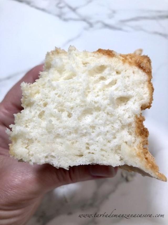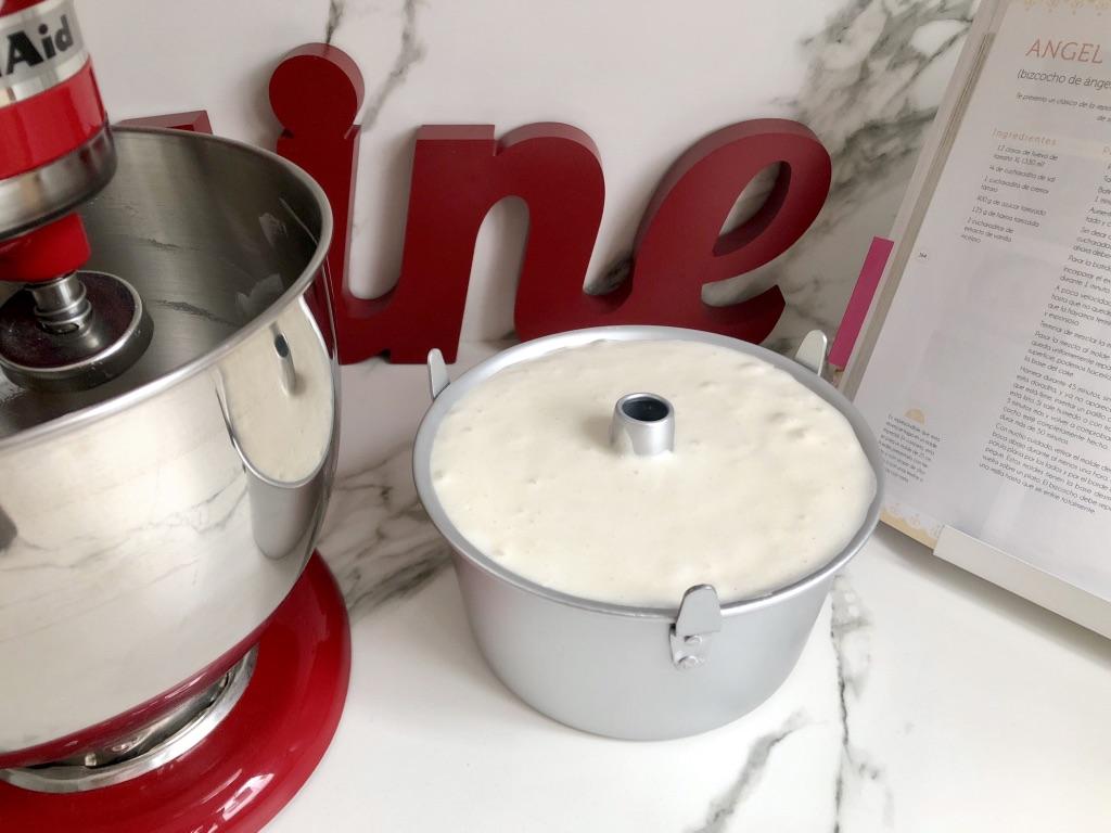 El Angel Food Cake es un bizcocho esponjoso y muy muy aireado. Lo podríamos traducir como Bizcocho de Ángel. El secreto es formar un buen merengue francés. Un bizcocho de claras, sin levadura, sin materia grasa y el resultado es como nube de azúcar. Riquísimo. Eso sí, si le tengo que poner una pega es el desmoldado. Se ha de utilizar un molde hondo especial con chimenea, patitas y de aluminio y bajo ningún concepto se untan las paredes del molde con mantequilla o aceite, va “desnudo”. La masa sube agarrándose a las paredes del molde, de ahí que no se engrase. Una vez horneado se le da la vuelta al molde y se deja así durante 1h, de lo contrario el bizcocho baja. Pasado ese tiempo, para desmoldarlo, se separa el bizcocho de las paredes con la ayuda de una espátula haciendo un movimiento circular para despegarlo. Después se utiliza la misma técnica para retirar la chimenea. El desmoldado no es el más perfecto pero el resultado del bizcocho es increíble.