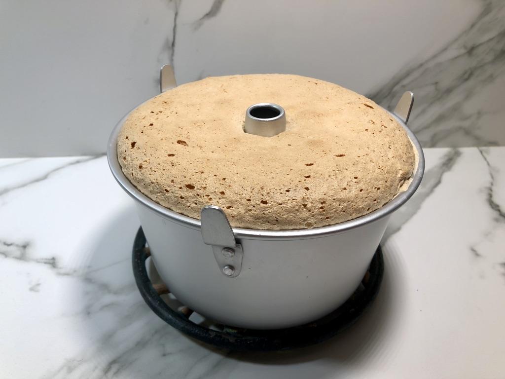 – Una vez listo el Cake sacar del horno y voltear inmediatamente. De esta manera se evita que la gravedad pueda hacerlo colapsar bajo su propio peso. A veces me ha pasado que en mi molde de 18 cm he vertido una cantidad de mezcla que en principio era para un molde de 24-25 cm y ha crecido tanto que al dar la vuelta al molde la “barriga” del cake se toca con la encimera. Lo podéis arreglar poniendo un supletorio a las patas, yo pongo 3 rodajas de madera que tengo. En la página de Martha Stewart tiene una curiosa manera de poner a enfriar el cake.