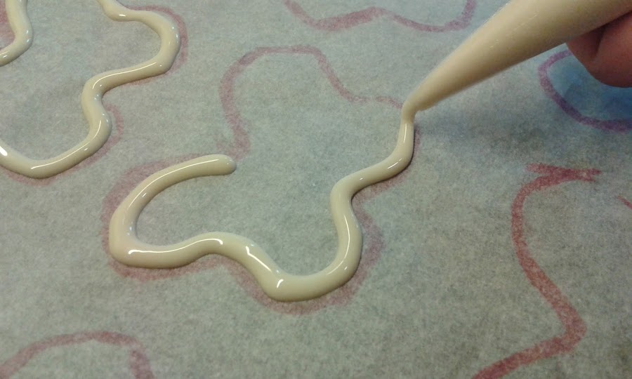 Se rellena una manga pastelera con el chocolate; con una boquilla o corte pequeño. Se hace primero el borde de las alas y de las aureolas.