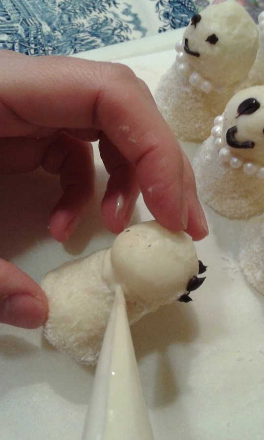 Ahora se le ponen las perlitas. Para ello se añade alrededor del cuello una hilera de chocolate blanco templado y se van poniendo las perlitas de una en una.
