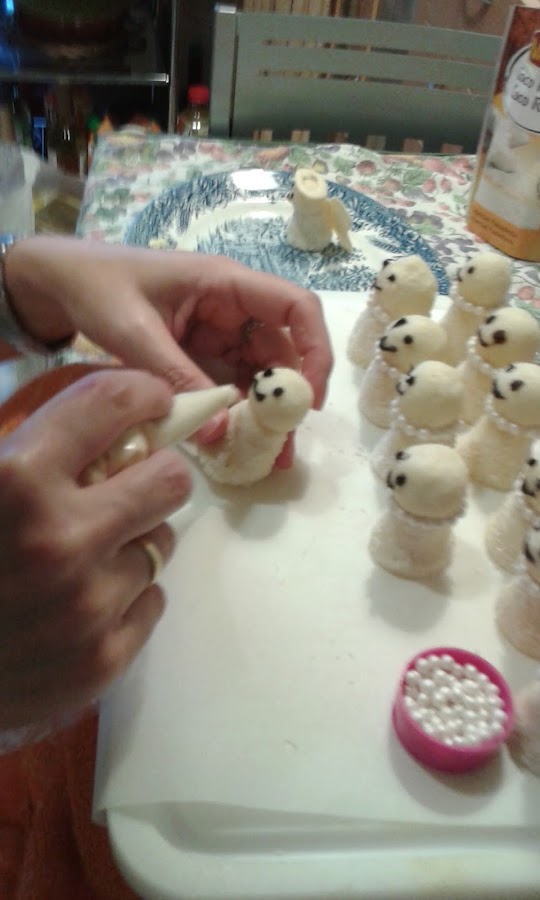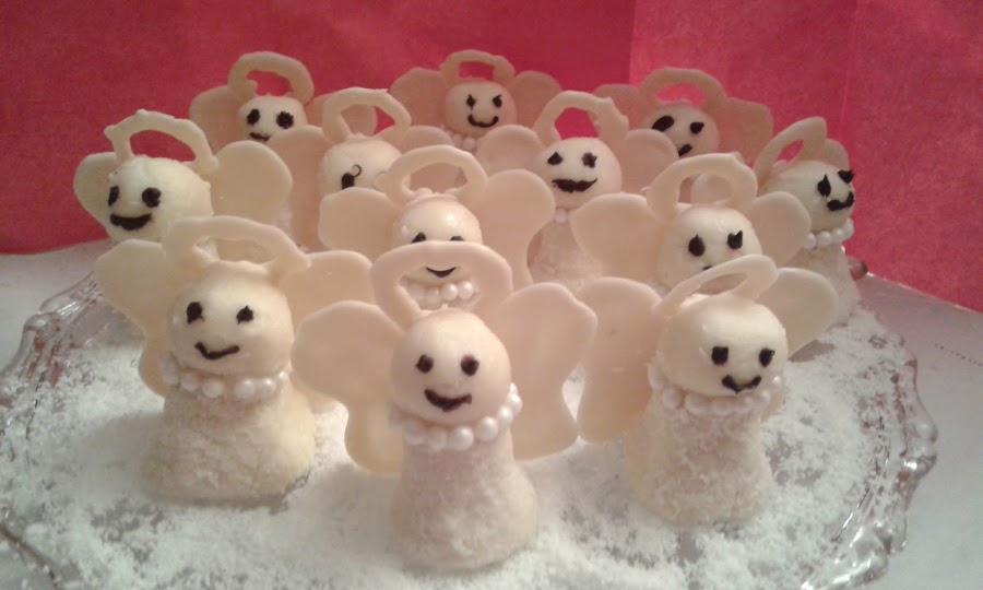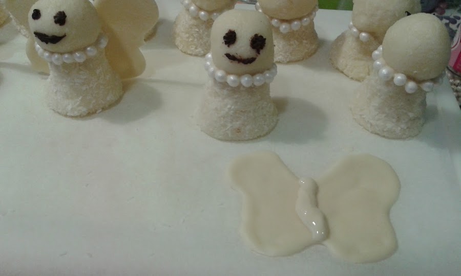 Cuándo estén todos "emperladosss", le ponemos las alas y la aureola. Para ello le ponemos a la parte frontal del ala una hilera de chocolate blanco para pegarlo a la espalda del angelito, con suma delicadeza.