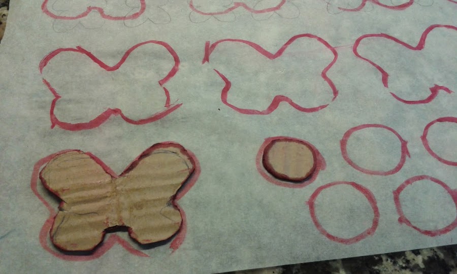 Se pinta sobre el cartón un ala y una aureola, se recorta con esmero y luego se pone encima del papel de horno y se van pintando con un rotulador, a continuación se le da la vuelta al papel y se rellena por el lado sin pintar.
