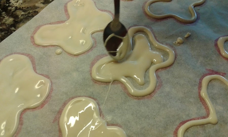 Se funde chocolate blanco normal (de bocadillo) en el micro 1mts., si no está del todo, ponerle de 20 en 20segundo hasta que se vea blando y se pueda disolver bien al batirlo, no ponerlo más temperatura pues tendrás que esperar para que se quede tibio que son unos 30ºC o 27ºC. para poderlo moldear y que no se escurra.