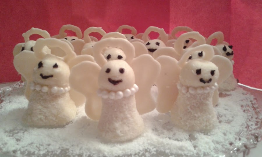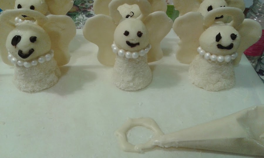 Se hacen bolitas para la cabeza y otra, como el doble que la cabeza, para el cuerpo. La cabeza no se reboza de coco. El cuerpo se hace como una croqueta pero más ancha en un lado que en otro y los extremos planos. Se reboza con el coco mientras se le da forma al cuerpo y se le pone también coco a la base para evitar que se peguen. Se pone el cuerpo de pié y se une a la cabeza con un palillo al que le cortaremos una puntita para que no se vea y así podrás obtener una medida para el tamaño del angelito, medirá poco más que un palillo de alto.