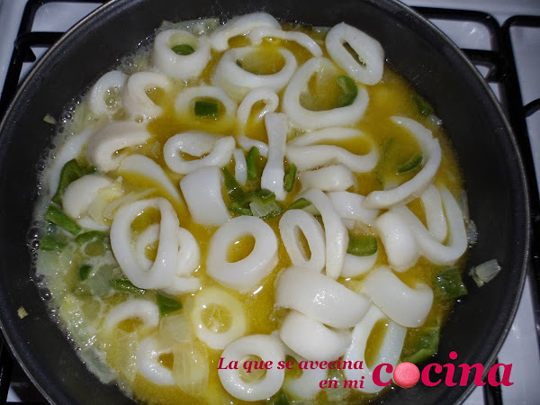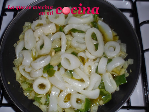 Mientras lavaremos las anillas, las sazonaremos y las añadiremos a la sarten en el momento que veamos que las verduras están pochadas. Removemos bien para que los calamares se impregnen bien del sabor del sofrito.