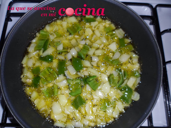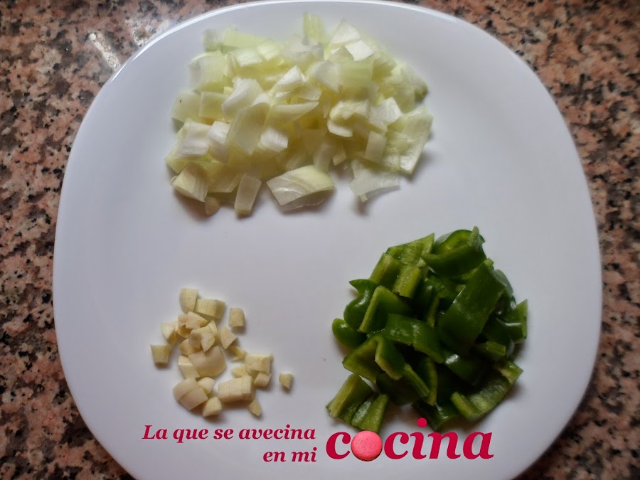 Comenzaremos nuestra receta picando la cebolla, el ajo y el pimiento en trocitos pequeños. Mientras tanto habremos puesto a calentar una sartén o cazuela con el fondo bien cubierto de aceite de oliva.
