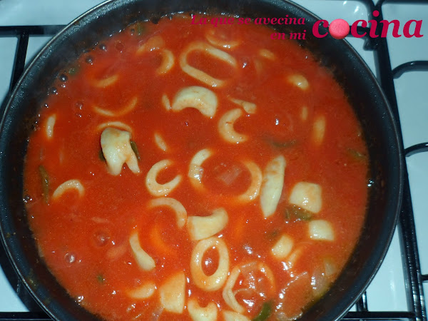 Una vez que pase ese tiempo rectificamos de sal si fuera necesario y ya tendríamos listas nuestras anillas de calamar con tomate. Os recomiendo que tengáis a mano bastante pan, porque la salsita está de muerte... :)