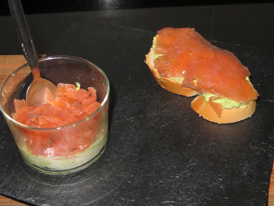 Ahora si decidimos servirlo en vaso colocamos en el fondo la crema de aguacate y encima el salmón y si hemos elegido en tosta, cogemos un buen pan lo tostamos un poco y ponemos encima el aguacate y el salmón y ya está listo para servir.