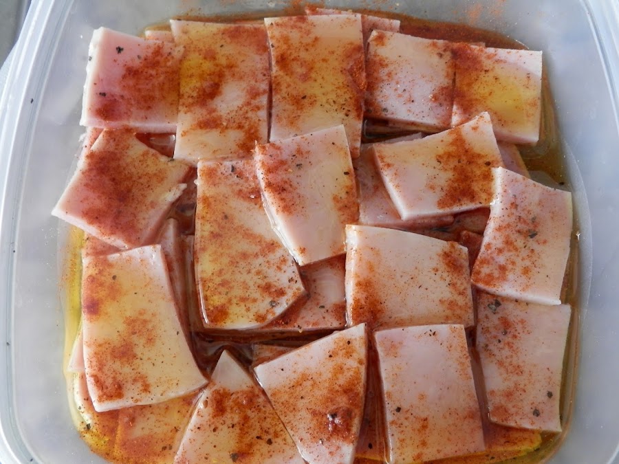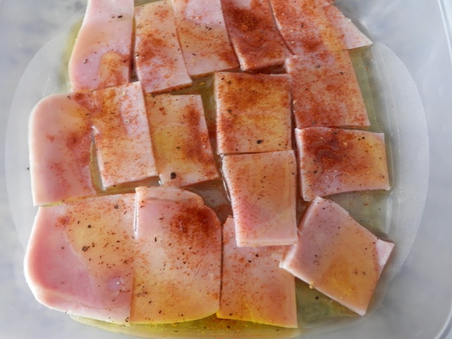En el táper que vayamos a poner en el frigo, ponemos una capa de jamón york y echamos un poco de pimienta negra molida y un poco de pimentón.