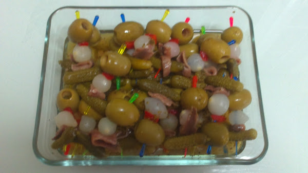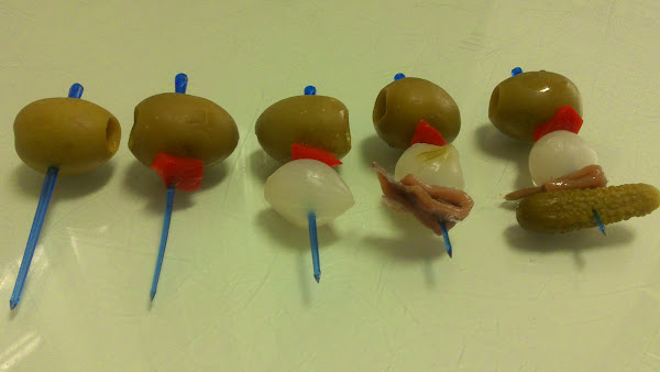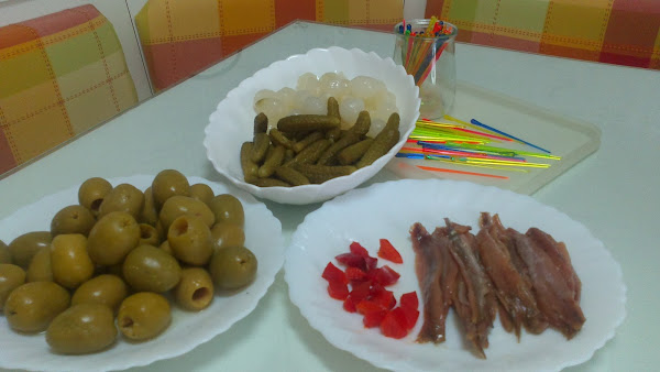 Con estos ingredientes os vamos a mostrar como hacer unos pinchitos muy buenos y fáciles de montar. Ingredientes:-Aceitunas (grandes y sin hueso). - Pepinillos sabor anchoas.- Cebollitas sabor anchoas.- Anchoas.- Pimientos.- Oregano.- Aceite de oliva.- Pinchos (palillos).- Una pizca de ilusión. Hemos cogido una tartera de cristal con su tapa para colocar nuestros pinchitos. La colocación ess fácil solo insertar en los pinchos los ingredientes con un orden decorativo, no solo por volumen si no por colores. Para facilitar nuestro trabajo vamos a poner los ingredientes en platos individuales. Las anchoas las cortamos por la mitad, para que den un toque de sabor y no predominen demasiado. Os mostramos las imágenes con los pasos:. Como veis primero ponemos la aceituna seguimos con el pimiento y con la cebollita, colocamos la anchoa y terminamos con el pepinillo, como os decíamos es muy fácil. Los colocamos en la tartera con el aceite de las anchoas, un poquito de orégano y un chorrito de aceite. Si lo dejáis macerar de un día para otro estarán mucho mejor.La ilusión que le ponemos no es visible, pero seguro que entre vuestros invitados la notan, mientras degustan estos pinchitos. Feliz Cumpleaños PILI.