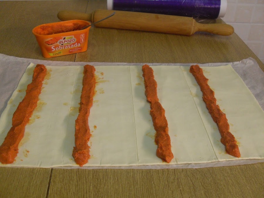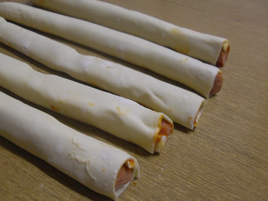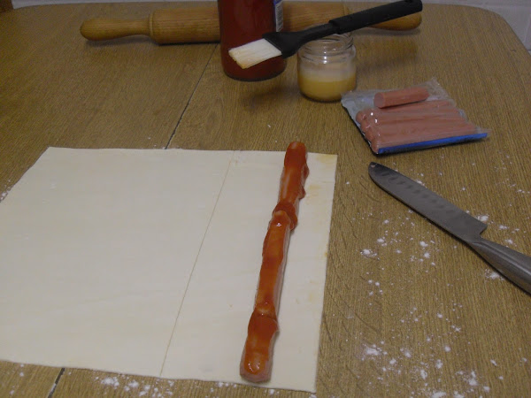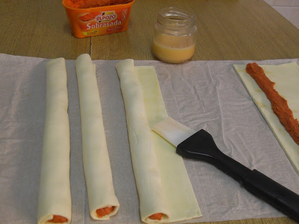 Cubrir con el kepchup y enrollar, dejando 2 cm al lado sin cerrar. Pasar el pincel con el huevo batido y terminar de enrollar.