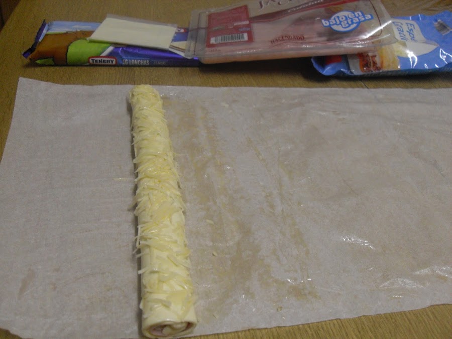 Enrollar dejando 2cm. en el final, pincelar con huevo batido y enrollar del todo.