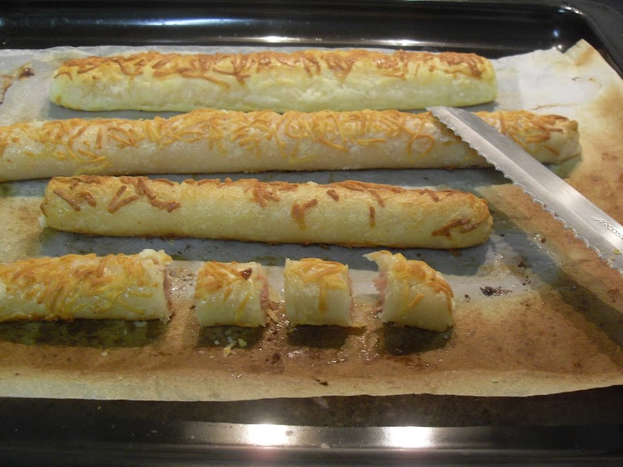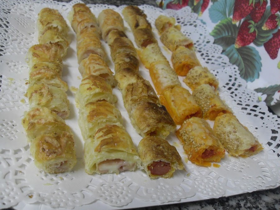 Cortar a 2 o 3 cm una vez que estén fríos, si no se deshace el hojaldre. Y con cuchillo de sierra me fue bien.