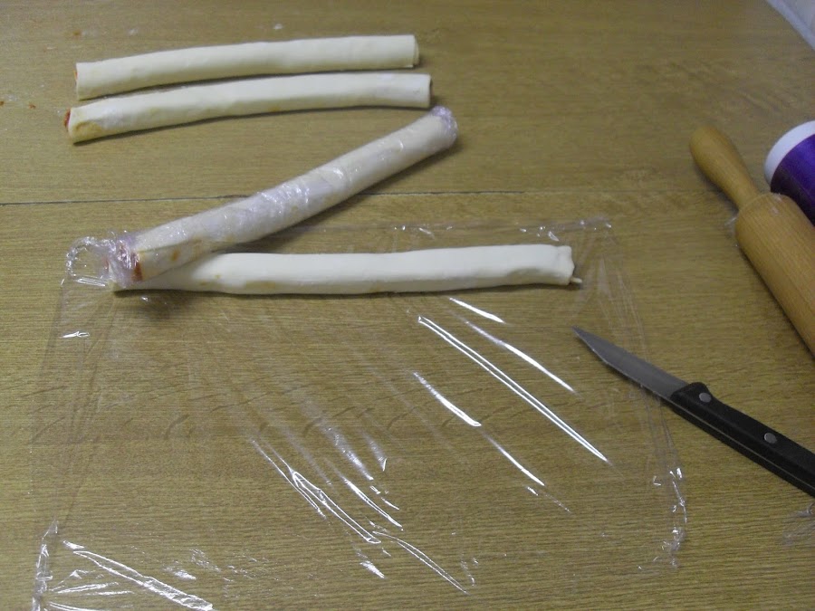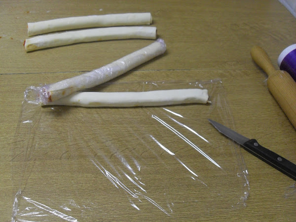 Los rollitos se pueden preparar con días de antelación, sin pincelar el exterior de huevo y cubriéndolos con film, como en la foto. Yo lo hago casi siempre, y los saco una hora antes de hornear. Luego se pincela de huevo batido y se hornean.