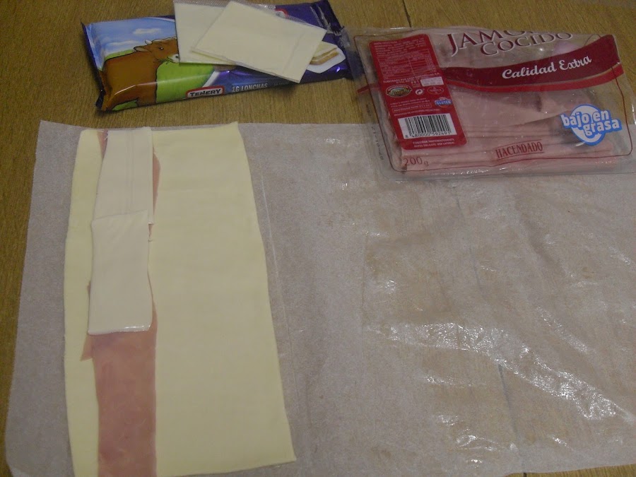 Cortar tiras de queso y de jamón cocido, como en la foto.