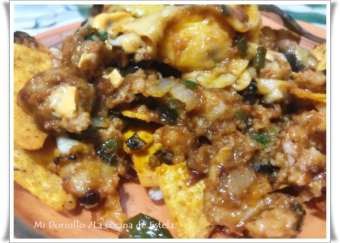 Encima de los nachos ponemos la salsa que hemos preparado con la verdura y albóndigas.