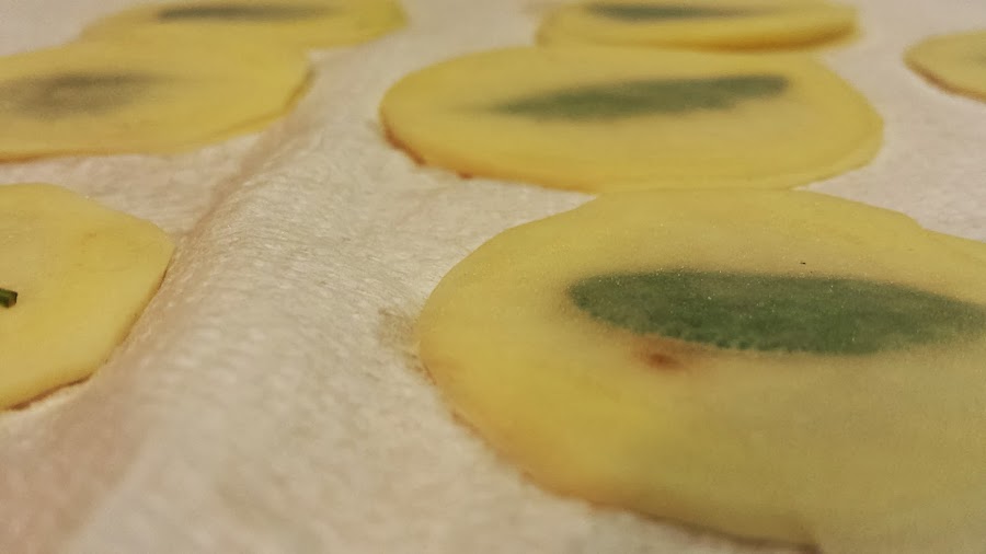 Lavamos bien las hojas de salvia y las secamos con papel de cocina. Ponemos una hoja de salvia en el centro de una de las rodajas de patata y cubrimos con otra rodaja, presionando bien por los bordes para que se peguen bien y no se separen al freír.