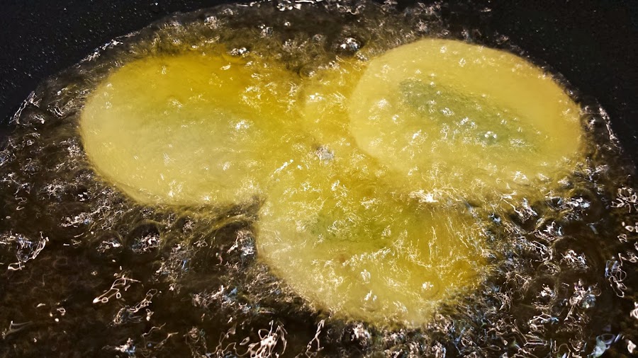Es importante que antes de freír las patatas, pongamos estas entre dos hojas de papel absorbente y presionemos bien para sacar la humedad y a la vez, hacer que se peguen mejor.