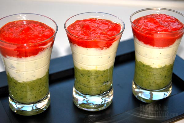 Para montar el vaso, ponemos el calabacín en el fondo del vaso, después ponemos el yogur, y por último el pimiento morrón y lo decoramos con un chorríto de aceite y una pizca de orégano.