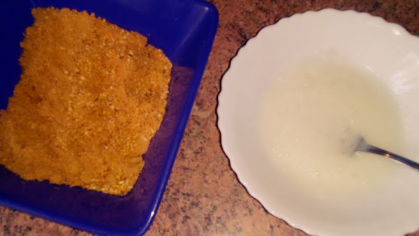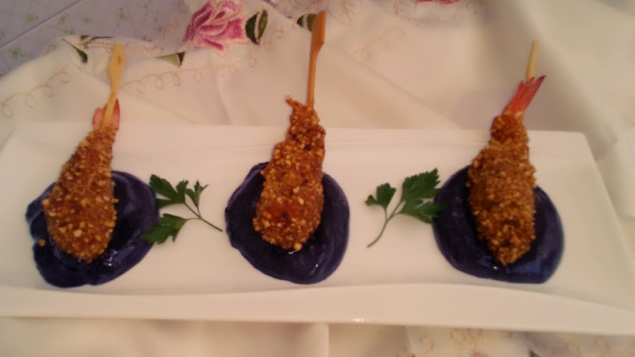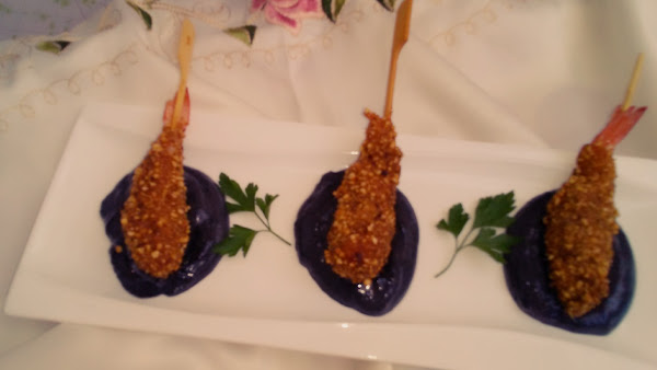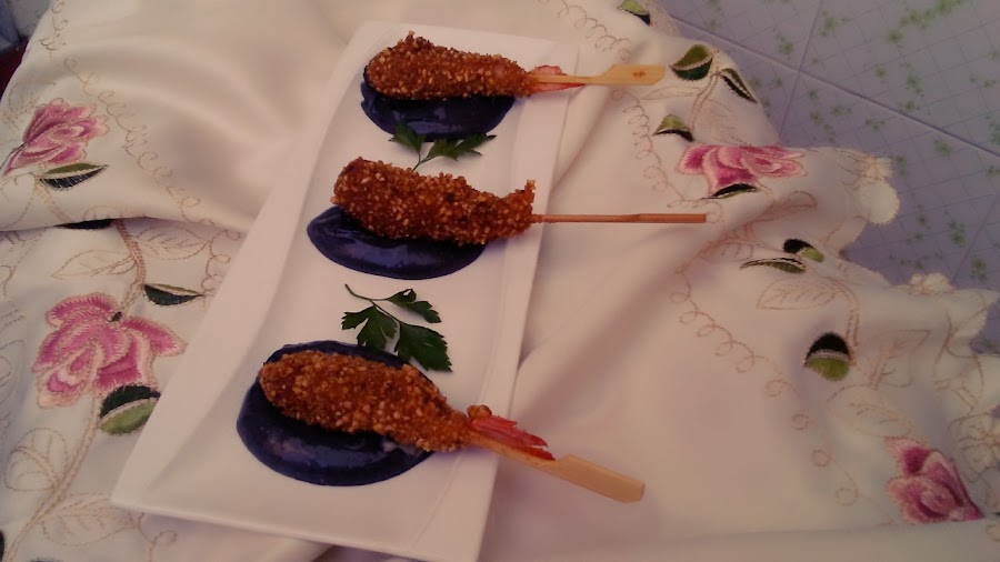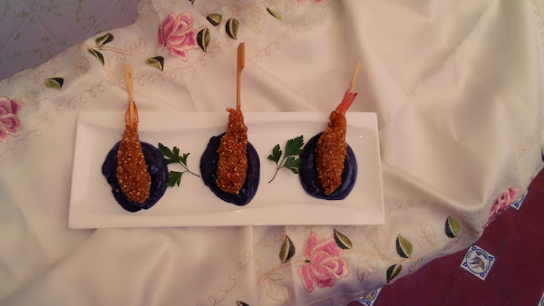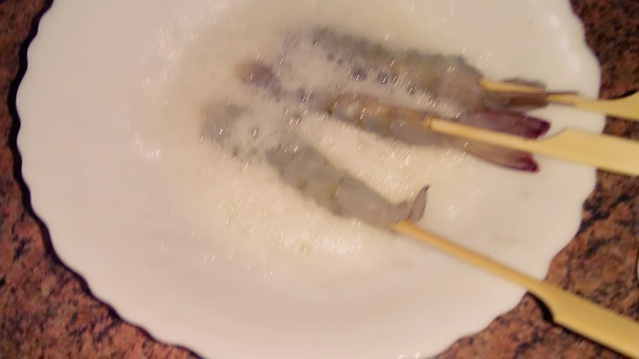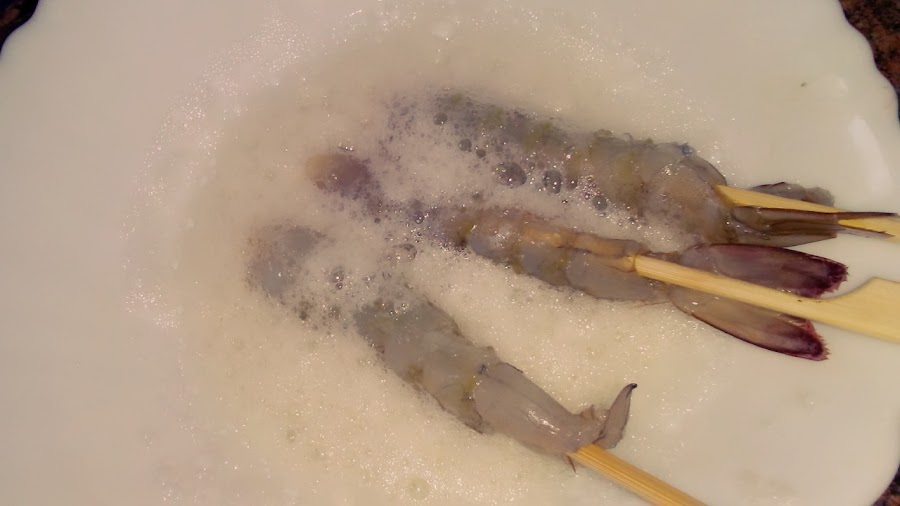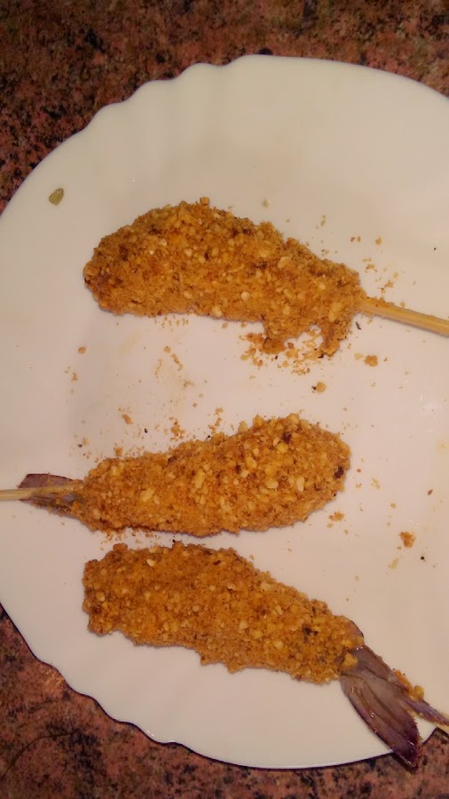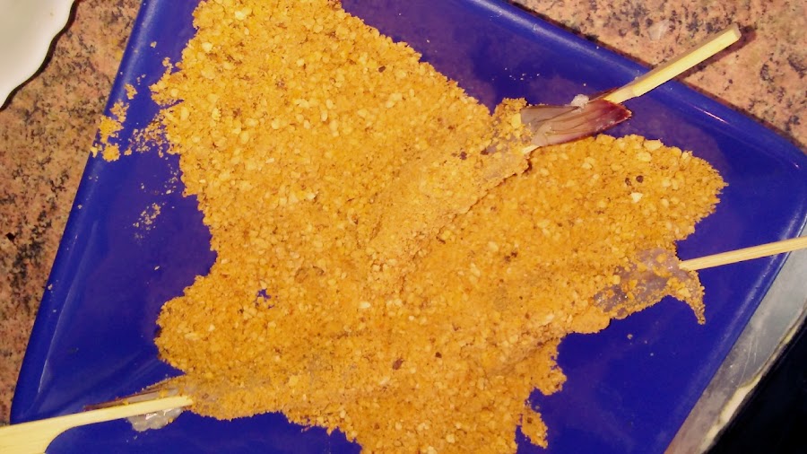 Batir la clara sin que llegue a punto de nieve. Mojar los langostinos ya empaladados en palillos en la clara y rebozar en el polvo de kikos, volver a mojar en clara y volver a rebozar.