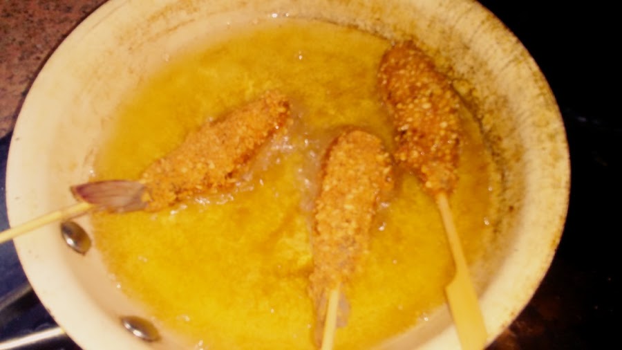 En una sarten o freidora meter los langostinos rebozados sin soltarlos para que los palillos no se quemen y reservar.