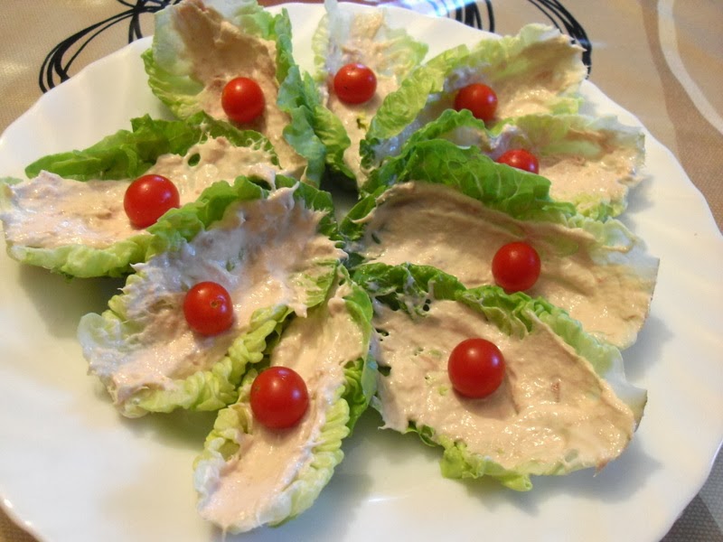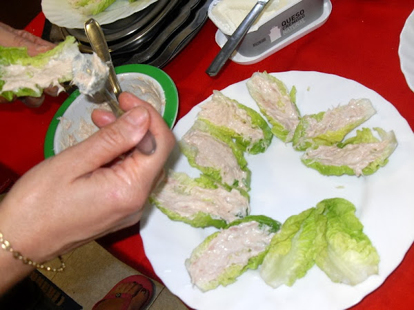 Deshojar los cogollos, lavar y secar con papel de cocina. En un bol mezclar mayonesa y atún desmigajado,rellenar las hojas y colocar encima un tomate cherry.